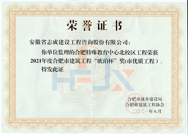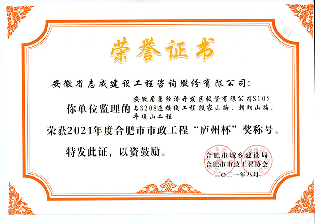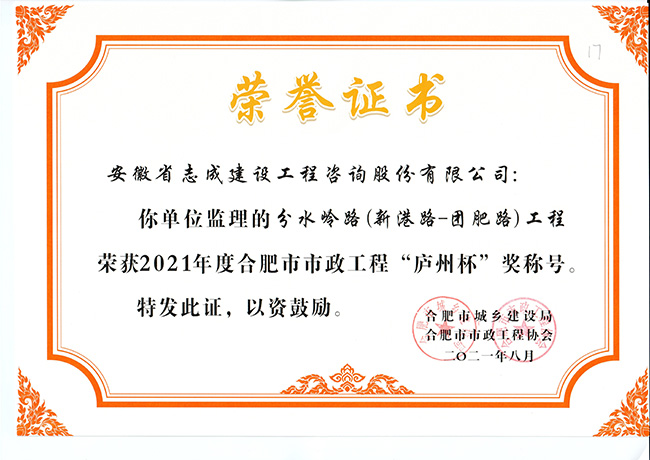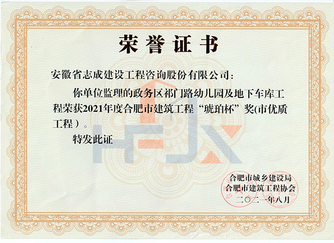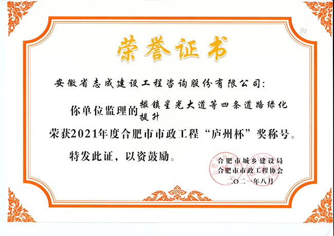 我公司合肥市特殊教育中心北校區工程、政務區祁門路幼兒園及地下車庫工程、合肥煙草工貿總公司易地技改建設項目-聯合工房工程喜獲2021年度合肥市建筑工程“琥珀杯”獎;.瑤海區小板橋河水體達標整治理工程、合肥高新區2019年度第四批綠化工程、分水嶺路(新港路-團肥路)工程、新站高新區淮海大道(新蚌埠路-文忠路)綠線綠化及淮海大道(前嶺路-畢昇路)污水管道修復工程、撮鎮星光大道等四條道路綠化提升工程、安徽居巢經濟開發區投資有限公司S105與S208連接線工程殷家山路、朝陽山路、平頂山工程、肥東縣縣級道路暢通工程(馬湖至石塘)道路綠化工程喜獲2021年度合肥市市政工程“廬州杯”獎。